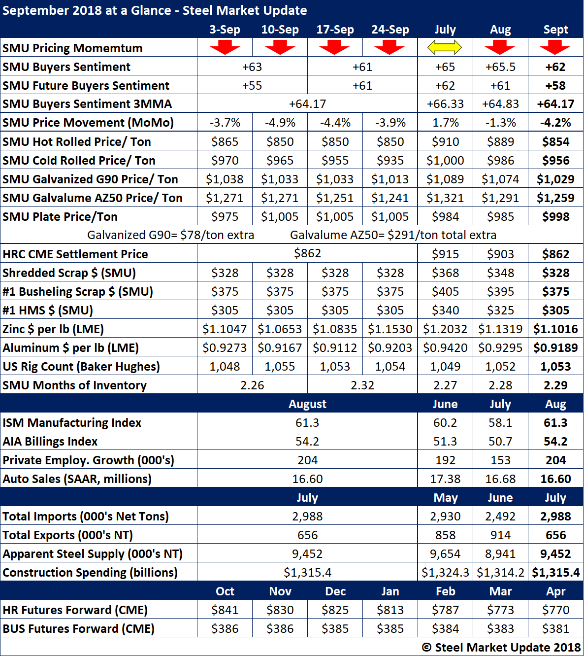 The month of September saw steel prices continue a steady decline that began in August. Steel Market Update data in the table below shows the benchmark hot rolled price slid from more than $900 per ton in the summer to the current price around $854. The same for cold rolled, which went from $1,000 a ton to about $956. The price of zinc has declined to $1.10 per pound, prompting the mills to lower their coating extras and the price of galvanized products. Ferrous scrap prices also have declined by about $40 per ton over the past three months, adding downward pressure on finished steel prices. SMU’s Price Momentum Indicator remains at Lower, meaning prices are expected to continue dropping for the next 30 days.