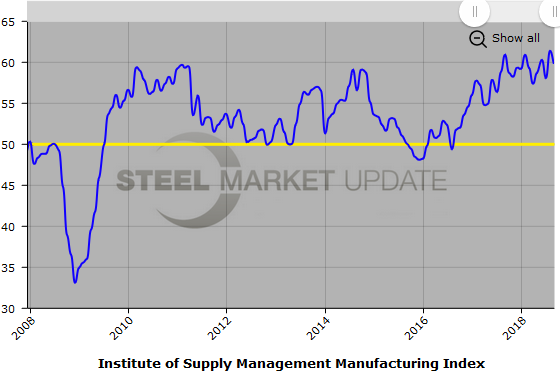 Below is a graph showing the history of the ISM Manufacturing Index. You will need to view the graph on our website to use its interactive features; you can do so by clicking here. If you need assistance logging in to or navigating the website, please contact Brett at Brett@SteelMarketUpdate.com.