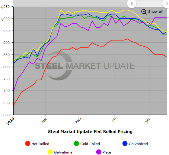 SMU Note: Below is a graphic showing our hot rolled, cold rolled, galvanized, Galvalume and plate price history. This data is available here on our website with our interactive pricing tool. Note that plate prices are not yet available on our website, but we are in the process of adding that dataset. If you need help navigating the website or need to know your login information, contact us at info@SteelMarketUpdate.com or 800-432-3475.