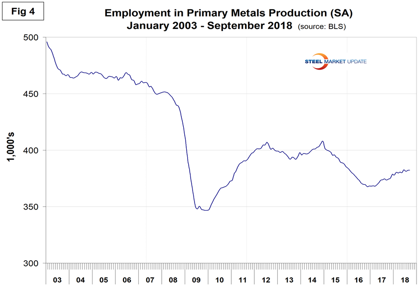 Table 1 shows that primary metals gained 200 jobs in September, and in the last 12 and 24 months, gains on a percentage basis were about the same as for total manufacturing. Figure 4 shows the history of primary metals employment since January 2003.