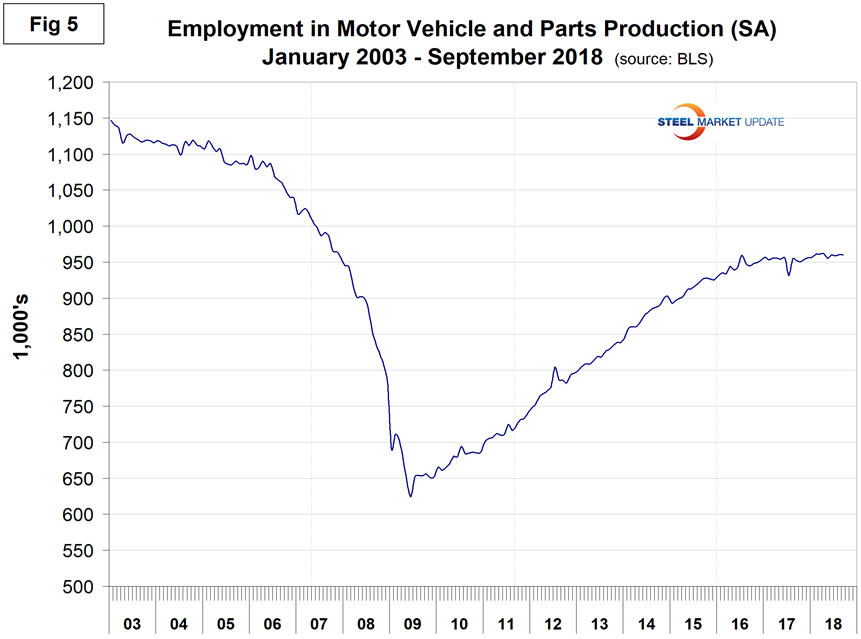 Motor vehicles and parts industries were reported to have lost 400 jobs in September. Figure 5 shows the history of motor vehicles and parts employment. The flattening in the last two years is a reflection of U.S. light vehicle sales.