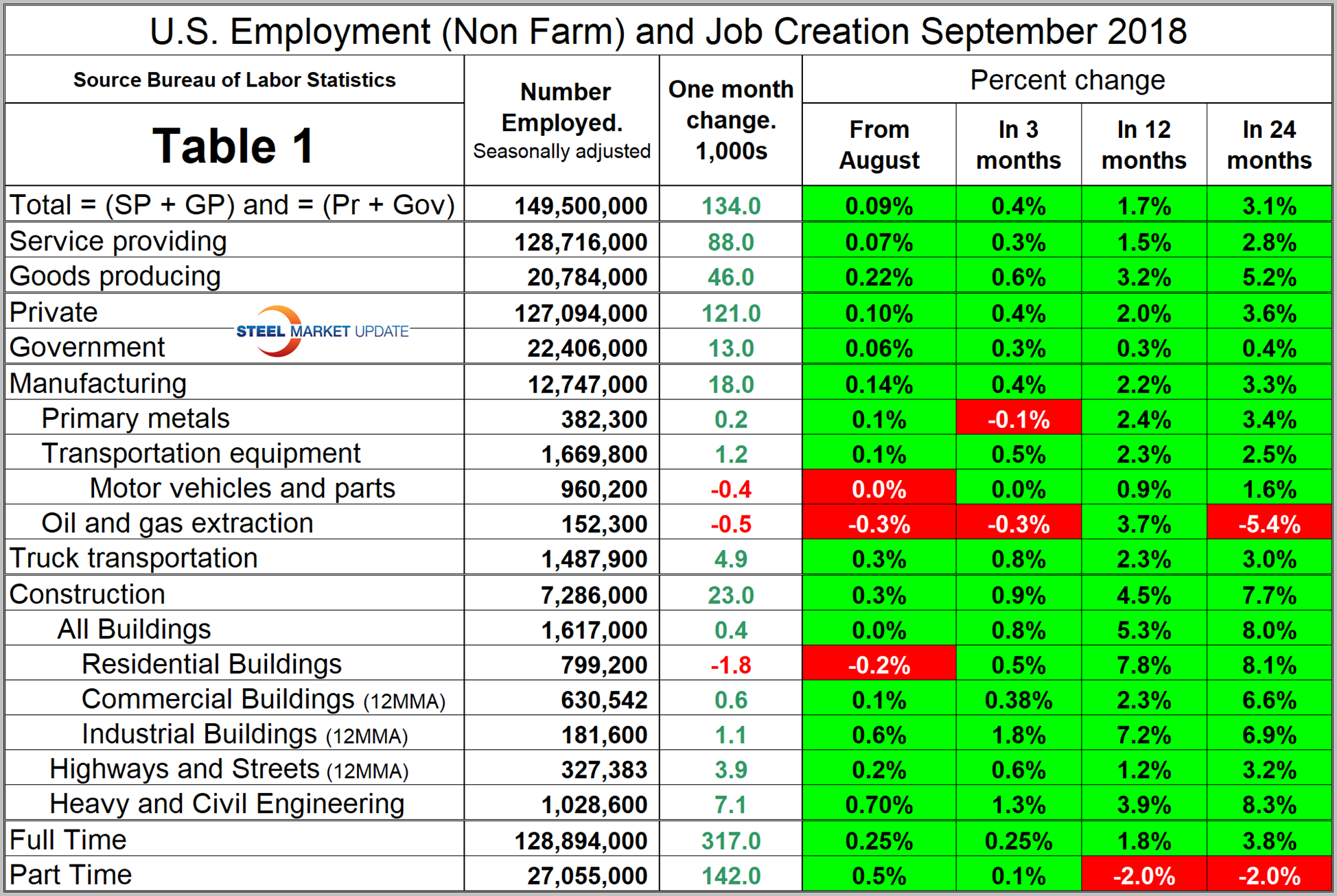 Table 1 breaks total employment down into service and goods-producing industries and then into private and government employees. Most of the goods-producing employees work in manufacturing and construction and the components of these two sectors of most relevance to steel people are broken out in Table 1.