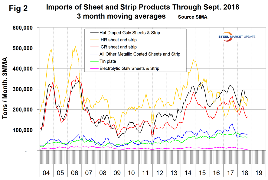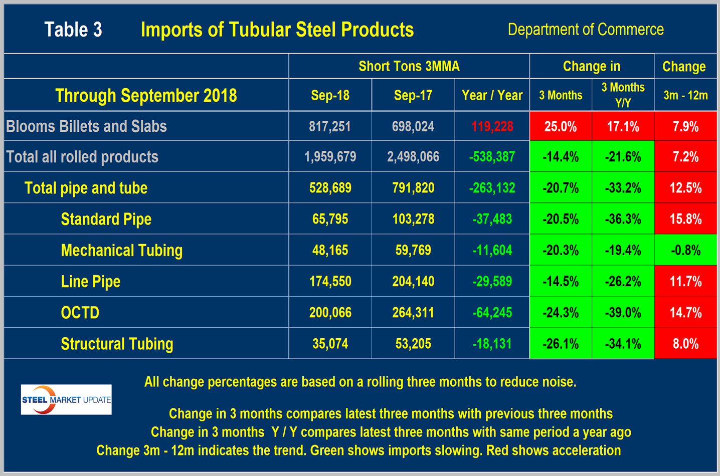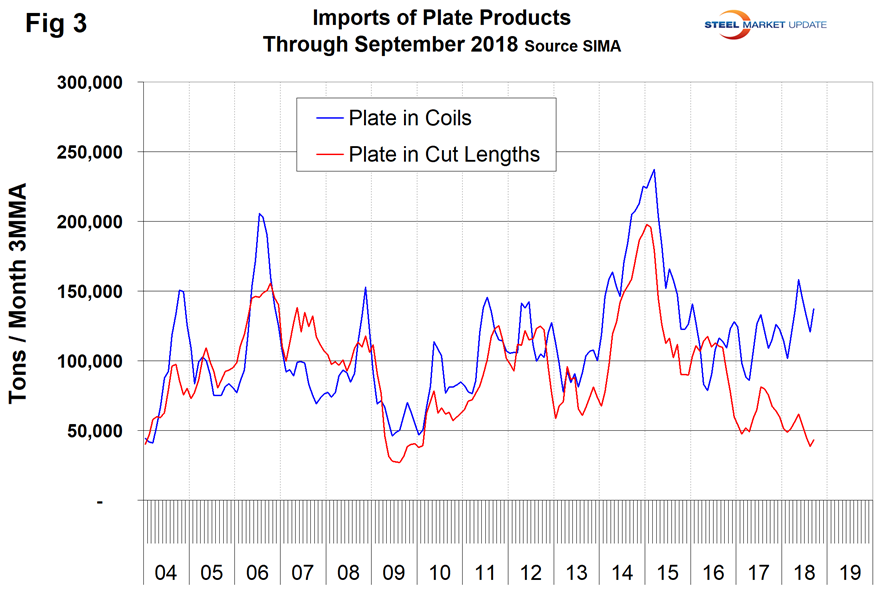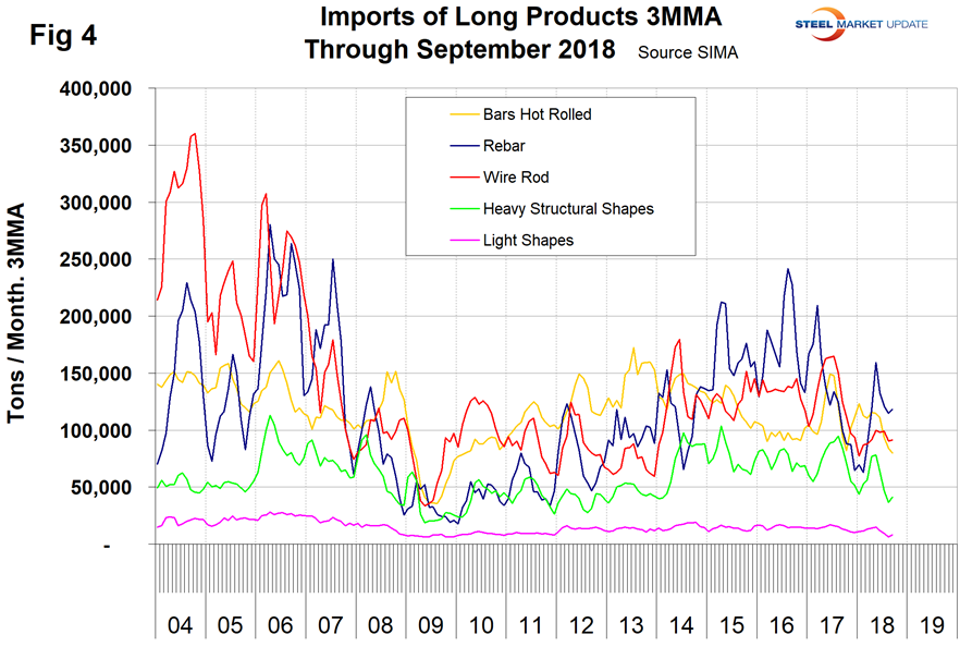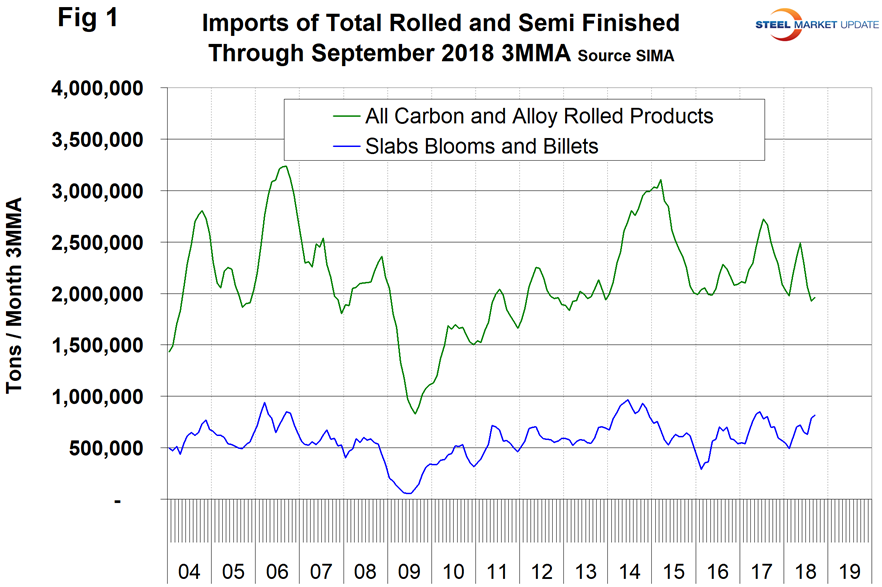 The volume of total rolled products in 2017 peaked in June and the year ended down 1.3 percent from where it began. The decline continued through February 2018, surged again through May, and declined each month June through August with a very slight increase in September. On a 3MMA basis, September was down by 14.4 percent from June. In our opinion, it is still too soon to conclude that this was due to the tariffs. We need a few more months of data to reach that conclusion.