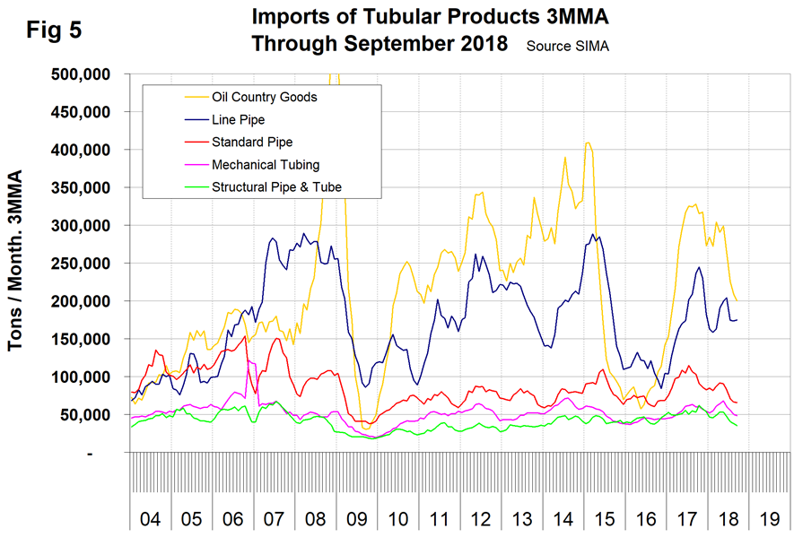 Table 3 shows that for tubular products the 3M/3M volume was down by 20.7 percent and the year-over-year volume was down by 33.2 percent. All individual products were down in both time frames. Figure 5 shows the history of tubular imports since 2004.