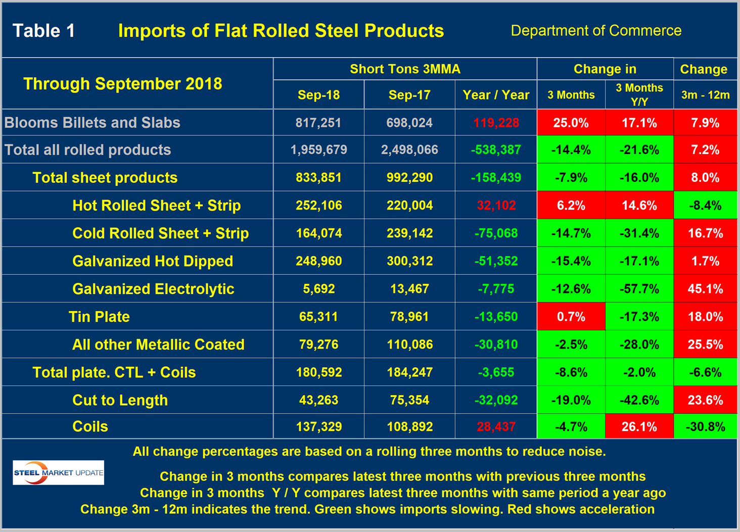 Beginning in January 2018, we have expanded this import analysis to include all major steel sectors: sheet, plate, longs and tubulars, with a total of 18 subsectors, and we now publish an import market share analysis for the same 18 steel product groups. Together, these two reports should give an accurate view of the effect of the Section 232 trade legislation as 2018 comes to a close. All volumes in this analysis are reported in short tons. We use three-month moving averages rather than single-month results to smooth out the variability.
