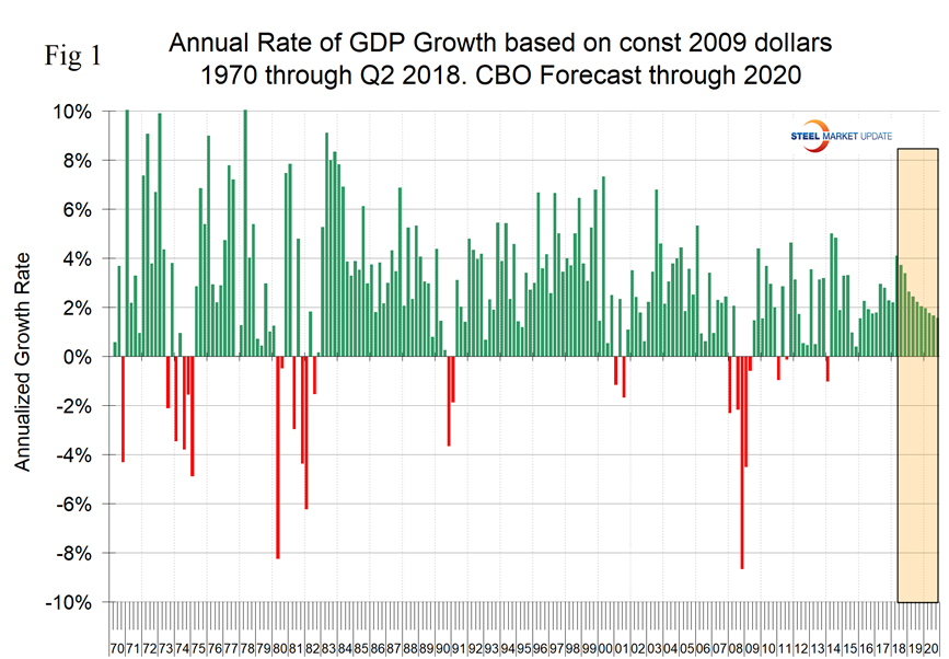 Figure 1 provides a history of U.S. recessions since 1970. Recessions occurred in 1974, 1980, 1981, 1990, 2001 and 2008. In Q2 2018, the latest data, the Bureau of Economic Analysis (BEA) reported GDP growth of 4.1 percent. This is a quarter-on-quarter result. On a trailing 12-month basis, GDP growth in Q2 was 2.87 percent. Congressional Budget Office economists expect economic growth to decline in upcoming quarters.
