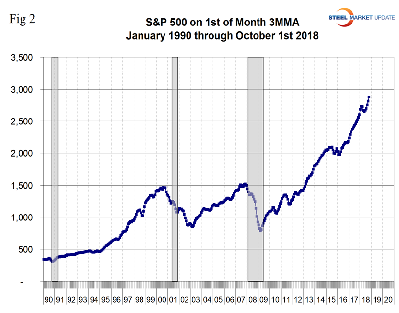 Figure 2 shows the three-month moving average of the S&P 500 on the first day of each month from January 1990 through October 2018. The stock market did predict the recession of 2001, but failed in 2008. Since then there have been several blips that proved of no significance. The tendency is that stock prices decline as investors anticipate a weakening economy and flagging corporate earnings. Fed tightening is also a factor in 2018.