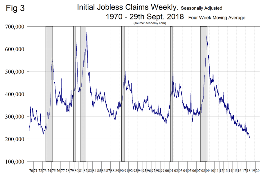 Figure 3 records new weekly claims for unemployment compensation. This indicator failed to predict the 1981 and 2008 recessions. It had a lead of over a year on the other four. Initial claims for unemployment insurance, reported weekly, are a sensitive measure of layoffs. Initial claims are currently at a 50-year low.