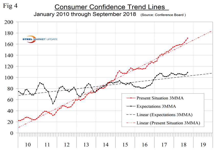 Consumer confidence is another key indicator of economic health. When consumers, businesses and investors lose confidence, it sets up a downward self-reinforcing spiral of reduced spending and investment, causing even higher unemployment and further depressing confidence. Consumers’ sentiment about the present situation and expectations are both strong and above their long-term trend lines (Figure 4).