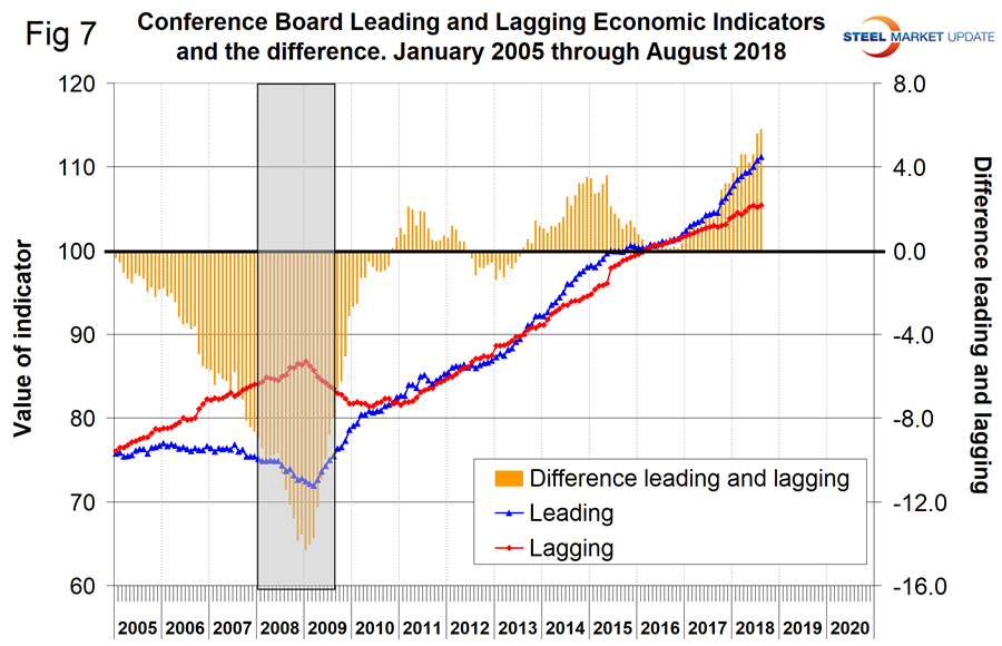 The Conference Board’s leading and lagging economic index is the chart we like the best, though we have no history before 2008 (Figure 7). We have subtracted one from the other in the rationale that if the lead is better than the lag, the situation is improving, or vice versa. The lead minus lag inverted three years in advance of the 2008 recession; certainly by 18 months before the big event it was clear something was happening. Through August this year, the spread was very healthy and widening.
