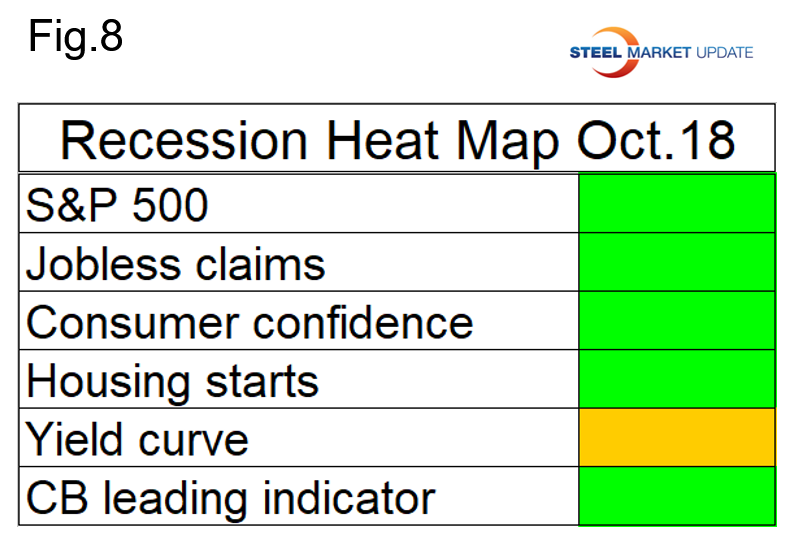 Figure 8 summarizes this data as a recession heat map. Only the yield curve is showing signs of distress. Unfortunately, that has been a powerful indicator in the past.