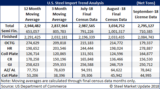 The U.S. Department of Commerce released Final Census Data on August foreign steel imports late last week. The final data shows August imports hit 3,034,752 net tons, just slightly above the 2,987,565 net tons reported for the month of July. Total imports continue to be resilient, mostly on the back of semi-finished steels (mostly slabs going to domestic mills). In August, semi’s account for one-third of the total imports with 1,001,317 net tons.