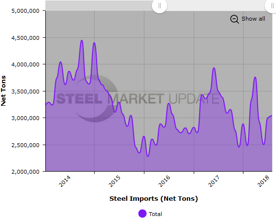 Below is a graph showing the history of total steel imports. You will need to view the graph on our website to use its interactive features; you can do so by clicking here. If you need assistance logging in to or navigating the website, please contact Brett at Brett@SteelMarketUpdate.com.