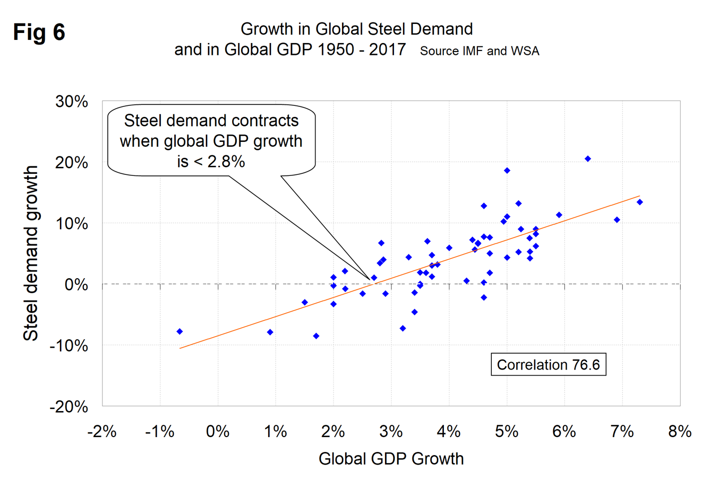 There is a relationship between the growth of GDP and steel demand at both the international and national levels, which also extends to other commodities such as cement. There are two interesting aspects to this relationship. First, the cyclical change in steel demand is vastly more volatile than the change in GDP, which we attribute to the inventory response throughout the supply chain. Second, as discovered by our friends at “Steel Guru,” 1 percent growth in GDP does not result in 1 percent growth in steel demand. At the global level it takes a 2.8 percent increase in GDP to get any increase in steel demand (Figure 6). This is a long-term average over a period of 65 years and, based on the added volatility of steel, can be a predictor of the immediate future. For example, after the disastrous decline in steel demand in 2009 there was no doubt that a huge cyclical rebound would occur as inventory managers throughout the world began to react to the economic recovery. If the IMF forecast proves to be correct, then the growth in global steel demand will average around 3 percent annually through 2023.