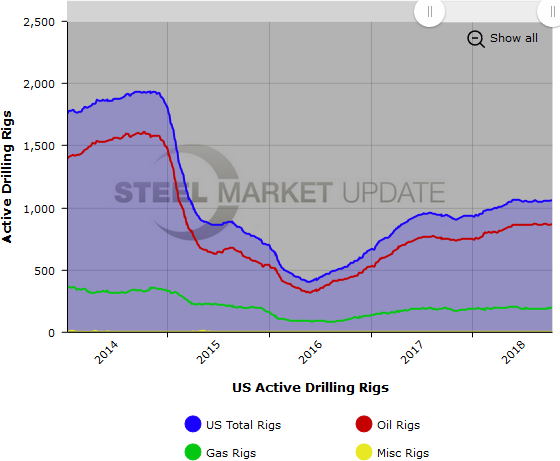 The U.S. active rig count, an indicator of oil country tubular goods demand, increased this week, according to oilfield services company Baker Hughes. The number of active U.S. rigs rose by 11 to 1,063, with oil rigs up 8 to 869 rigs, gas rigs up 4 to 193 rigs, and miscellaneous rigs down 1 to 1 rig. Compared to this time last year, the 1,063 count is up 135 rigs, with oil rigs up 126, gas rigs up 8, and miscellaneous rigs up 1. See the first graph below for a history of active U.S. rig counts.