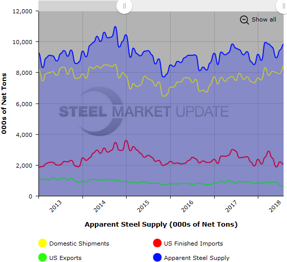 To see an interactive graphic of our Apparent Steel Supply history (example below), visit the Apparent Steel Supply page in the Analysis section of the SMU website. If you need any assistance logging in or navigating the website, contact us at info@SteelMarketUpdate.com or 800-432-3475.