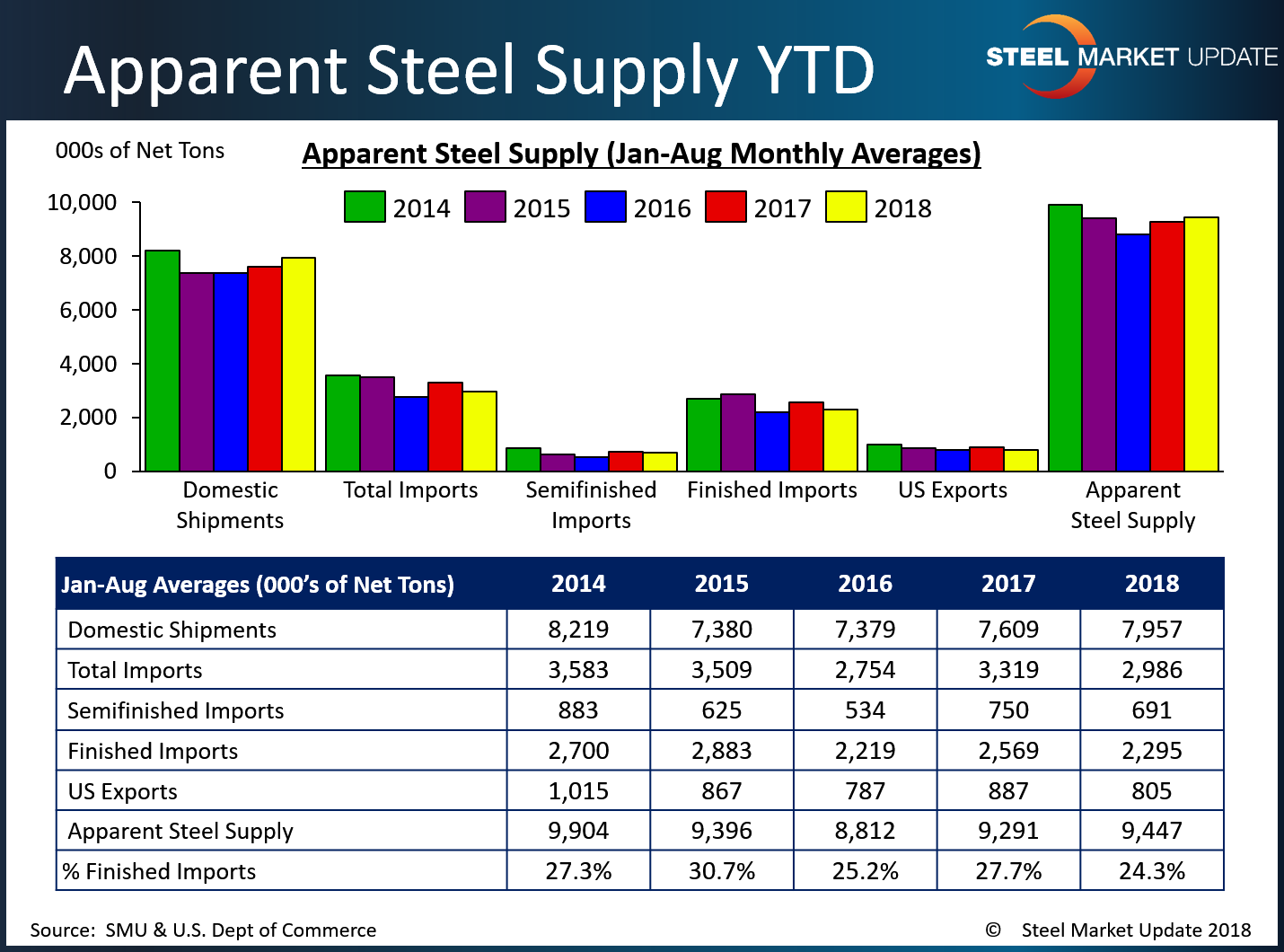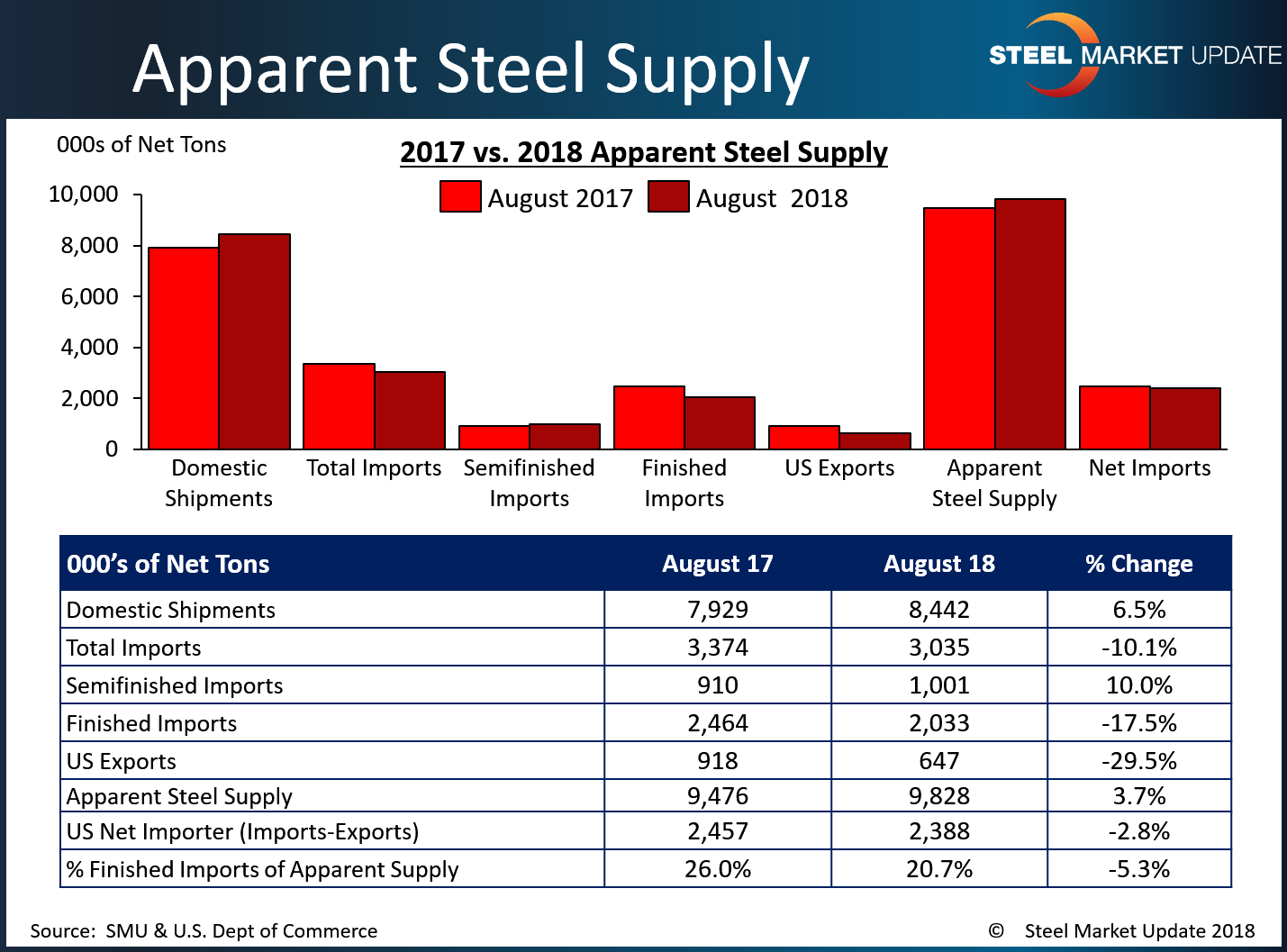 August apparent steel supply saw a 352,813 ton or 3.7 percent increase compared to the same month one year ago. This change was due to a mix of factors: an increase in domestic shipments of 512,802 tons or 6.5 percent, somewhat counteracted by a 430,814 ton or 17.5 percent decrease in finished imports and a decrease in total exports of 270,824 tons or 29.5 percent.