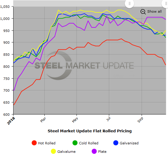 SMU Note: Below is a graphic showing our hot rolled, cold rolled, galvanized, Galvalume and plate price history. This data is available here on our website with our interactive pricing tool. Note that plate prices are not yet available on our website, but we are in the process of adding that dataset. If you need help navigating the website or need to know your login information, contact us at info@SteelMarketUpdate.com or 800-432-3475.