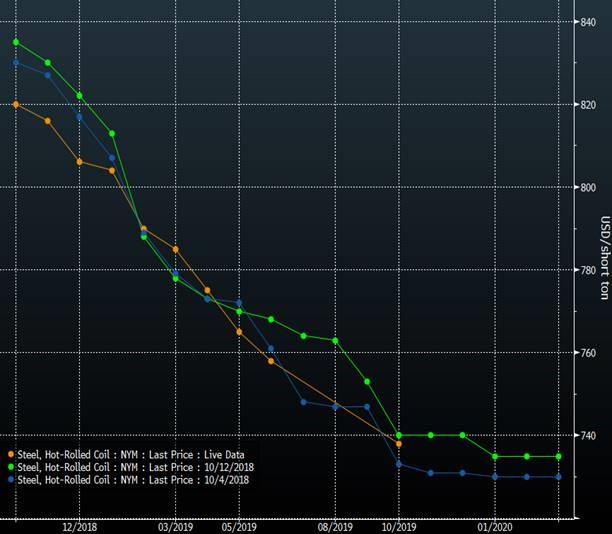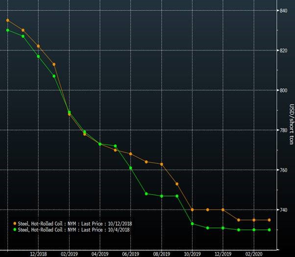 The chart below shows the change in the futures curve for HRC from 10/4 (Green) to 10/12 (Orange). On 10/10 was when Nucor announced the price increase.