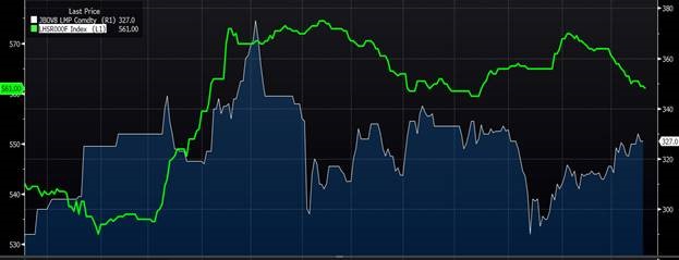 The chart below shows the curves again, with the Orange curve in this chart showing the most recent levels. The impact of the falling index level was felt hard on the front of the curve, with November and December getting hit hard.
