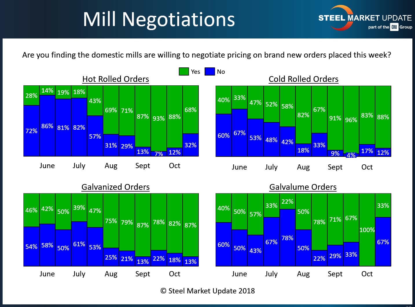 According to respondents to this week’s Steel Market Update market trends questionnaire, 68 percent of hot rolled buyers said they have found mills willing to talk price, down from 93 percent in mid-September. About 32 percent say the mills are now holding the line.