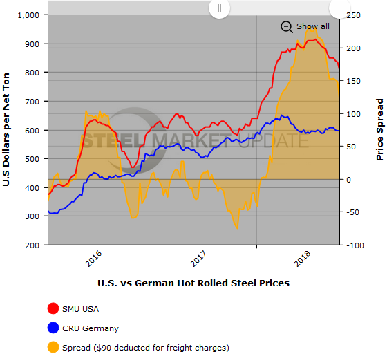 SMU adds $90 per ton to these foreign prices taking into consideration freight costs, handling, trader margin, etc. This provides an approximate “CIF U.S. ports price” that can then be compared against the SMU U.S. hot rolled price, with the result being the spread (difference) between domestic and foreign hot rolled prices. As the price spread narrows, the competitiveness of imported steel into the United States is reduced. If the spread widens, then foreign steel becomes more attractive to U.S. flat rolled steel buyers. A positive spread means U.S. prices are higher than foreign prices, while a negative spread means U.S. prices are less than foreign prices.