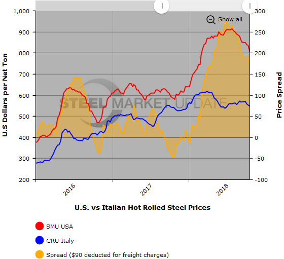 CRU published Italian HRC prices at $548 per net ton, down $5 over last week and down $11 compared to two weeks ago. After adding import costs, we get a delivered price of approximately $638 per ton. The spread between the Italy and U.S. figure is +$167 per ton, down from +$192 one week ago and down from +$191 two weeks ago. Meaning that U.S. HR is theoretically $167 per ton more expensive than importing steel from Italy. The spread has declined $24 over the last month and $77 over the past two months. The four-week average is now +$185, down $6 over last week.