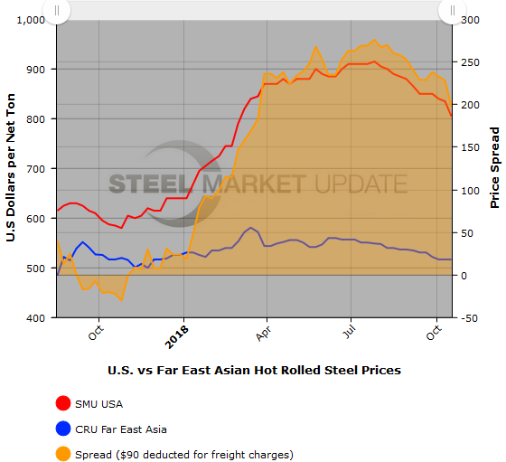 As of Wednesday, Oct. 17, the CRU German HRC price was $597 per net ton, unchanged from the previous week and down $2 from two weeks prior. Adding $90 per ton for import costs, that puts the price at $687 per ton from Germany delivered to the U.S. The latest Steel Market Update hot rolled price average is $805 per ton for domestic steel, down $30 over last week and down $35 from two weeks ago. The spread between German and U.S. HR prices is now +$118 per ton, down from +$148 last week, and down from +$151 two weeks ago. That means domestic HR is now theoretically $118 per ton more expensive than importing HR steel from Germany. The spread has declined $34 in total over the last month and $94 over the last two months. The four-week average price spread is now +$143 per ton, down $8 from last week.
