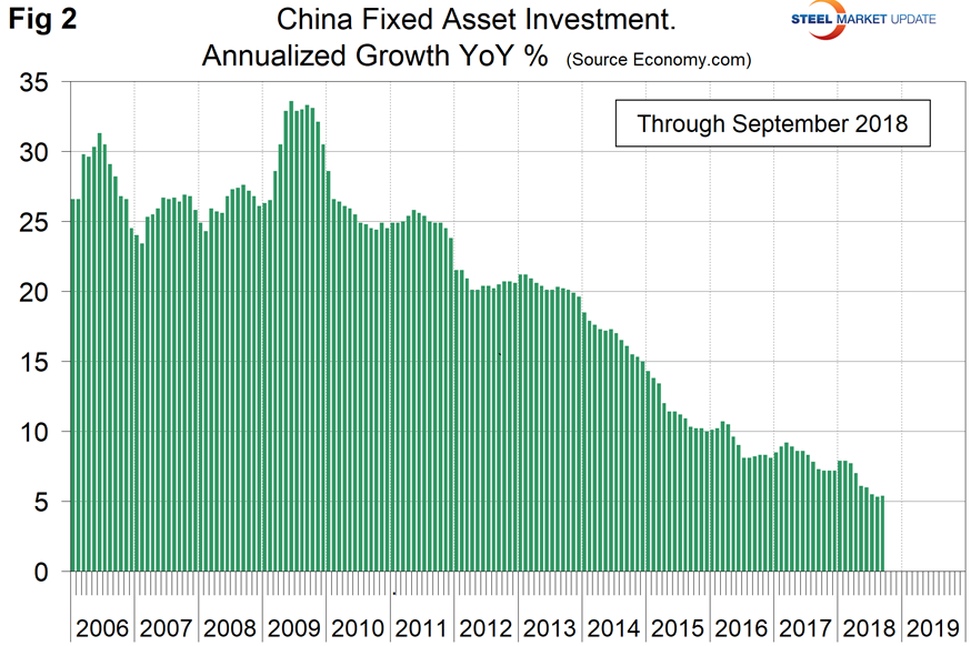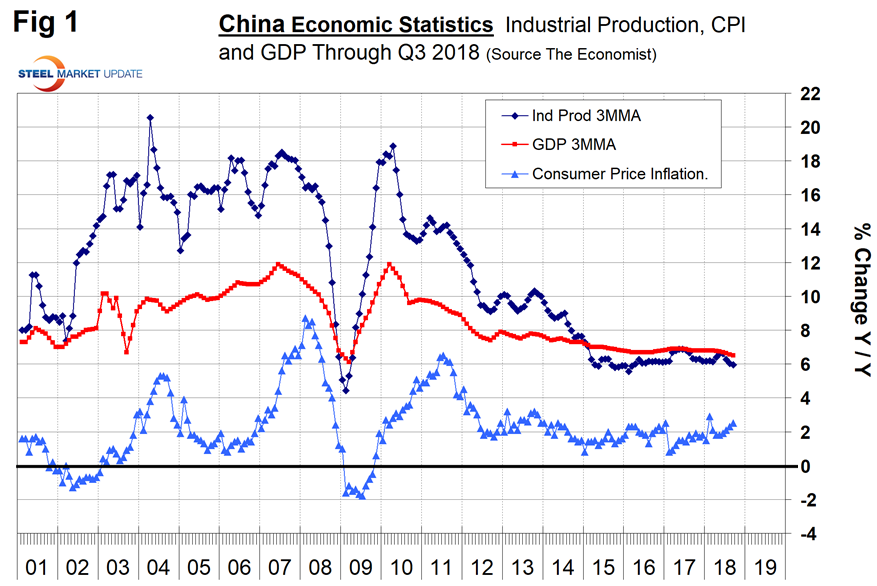 Once each quarter, Steel Market Update publishes the official statistics for Chinese GDP, industrial production, consumer price inflation and fixed asset investment. Many analysts don’t believe these self-serving Party figures, but we include them in our reports because of the importance of China on the global steel scene, and these numbers are all that’s available. China’s economic statistics are never revised, which makes them suspicious. The U.S. routinely makes revisions back decades. Figure 1 shows published data released this week for the growth of GDP, industrial production and consumer prices through the third quarter of 2018. The GDP and industrial production portions of this graph are three-month moving averages (3MMAs).