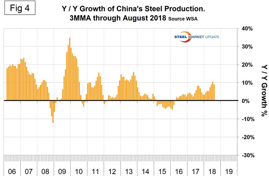 Figure 3 shows the 3MMA of China’s crude steel production through August when it accounted for 52.9 percent of global production. The World Steel Association is forecasting a deceleration in China’s steel production growth in 2019. Last week, the chairman of the WSA economics committee said that China is expected to experience zero growth in 2019, down from 6 percent this year. This is partly a result of trade tensions with the U.S., he reported.