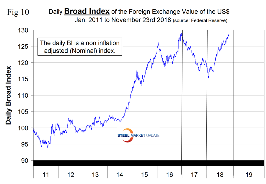 SMU Comment: There is an inverse relationship between commodity prices and the value of the U.S. dollar on the global currency markets. After falling for most of 2017 and through Feb. 1, 2018, the dollar has experienced a sharp upward revival and through Nov. 23 was up by 8.5 percent year to date (Figure 10). (Note: This is the daily index, which is not inflation adjusted. The monthly index mentioned above is inflation adjusted and isn’t updated until late the following month.) Supply and demand fundamentals are the primary drivers of raw materials prices, but a rising dollar acts as a headwind on the price of those global commodities that are priced in dollars. This effect is clearly shown by the relationship between scrap and the dollar index described above in Figure 6.