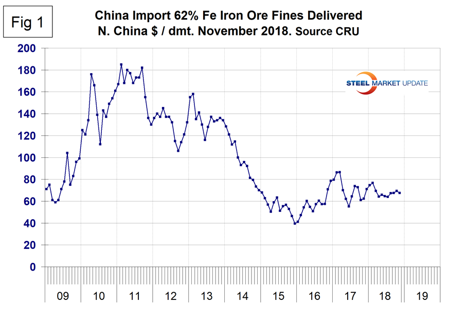 On Nov. 27, Mining.com reported: “Robust global steel output did nothing to stop a rout in iron ore prices on Monday, with the seaborne benchmark cratering amid growing fears about an economic slowdown in China and the impact of a trade war between the world’s two largest economies. Benchmark prices at the Chinese port of Qingdao of 62% Fe content ore fell 8% on Monday to trade at $64.25 per dry metric tonne, according to data supplied by Fastmarkets MB. Chinese steelmakers increasingly prefer high-quality imports from Brazil and Australia over domestic iron ore, but inbound cargoes fell to a four-month low of 88 million tonnes in November, despite heavy demand ahead of winter production curbs. Steelmaking coal (premium hard-coking coal FOB Australia) also retreated, falling to $218.46 a tonne on Monday and is now trading 16% lower than at the start of the year. The pullback in seaborne iron ore and metallurgical coal follows a sell off of steel futures in China, with Shanghai rebar entering a bear market – down more than 20% from seven-year highs hit in August.”