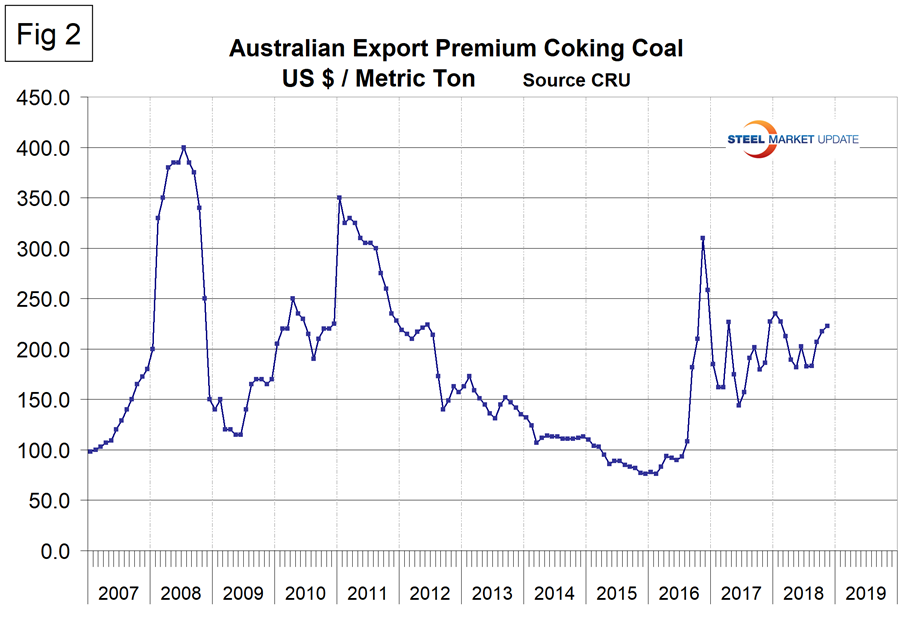 The price of premium low volatile coking coal FOB east coast of Australia has risen for each of the last four months. From February 2016 to November 2016, the price more than quadrupled from $76 to $310 per metric ton. On Nov. 28, the price stood at $223 per ton and has ranged between $144 and $235 per ton since January 2017 (Figure 2).