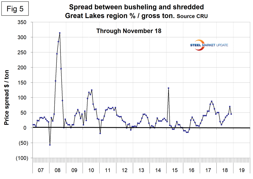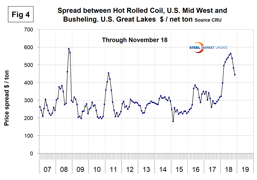 To put this raw materials commentary into perspective, we include here Figure 4, which shows the spread between busheling in the Great Lakes region and hot rolled coil Midwest U.S. through mid-November 2018, both in dollars per net ton. The spread has declined for three straight months to $443.39 in mid-November, but is still historically high and is up from $260.00 in June 2017.