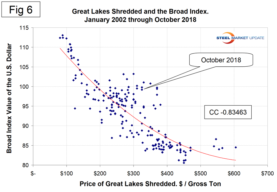 Figure 6 is a scatter gram of the price of Chicago shredded and the monthly Broad Index value of the U.S. dollar as reported by the Federal Reserve. The latest data for the monthly Broad Index was October. This is a causal relationship with a negative correlation of over 83 percent.