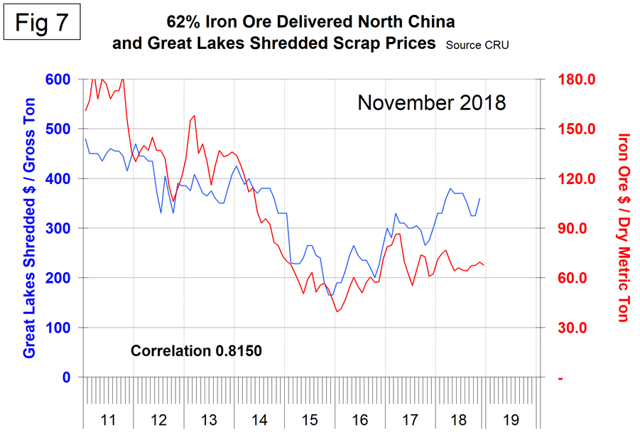 There is a long-term relationship between the prices of iron ore and scrap. Figure 7 shows the prices of 62% iron ore fines delivered N. China and the price of shredded scrap in the Great Lakes region through mid-November 2018. The correlation since January 2006 has been 81.5 percent. There has been a very unusual divergence in these prices since Q2 2017.