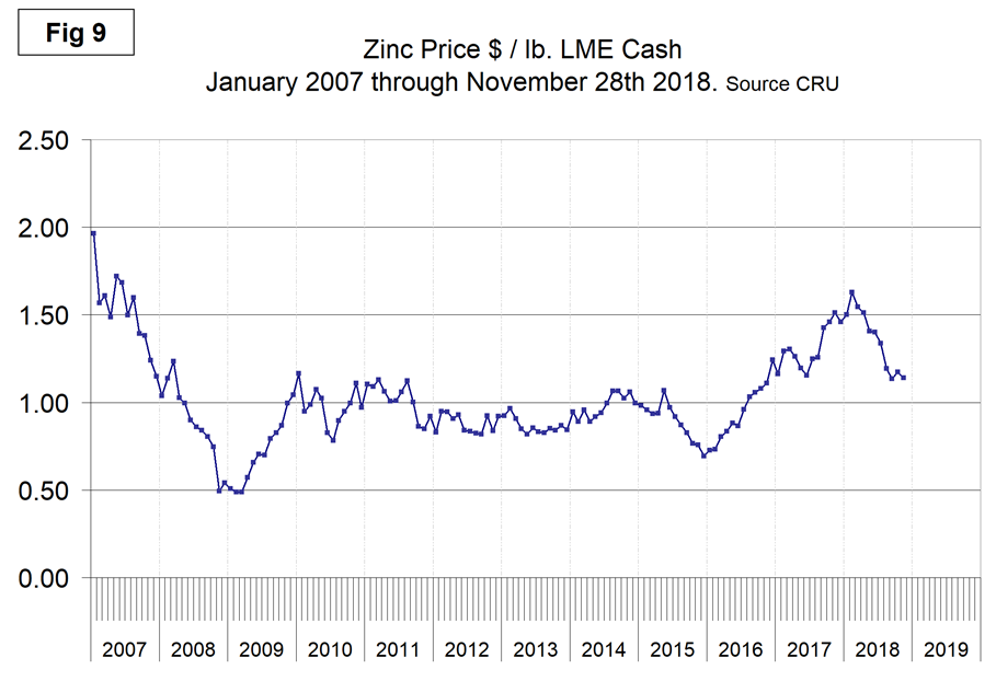 The LME cash price for zinc at the end of each month is shown in Figure 9. The latest data is for Nov. 28 when the price was $1.14 per pound, down from a high of $1.63 at the end of January. According to Bloomberg, zinc is the worst-performing base metal this year on the London Metal Exchange. “Continuously increasing LME inventories and weak Chinese demand added to worsening zinc fundamentals,” said Casper Burgering, an economist at ABN Amro Bank NV. “Supplies of zinc concentrates will continue rising. As a result, zinc prices will weaken further.”