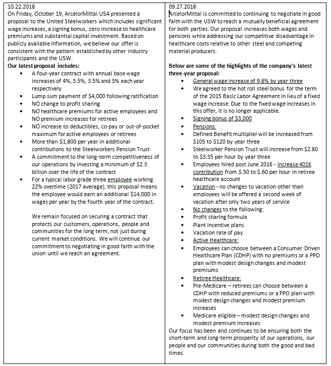 On Friday, Oct. 19, ArcelorMittal USA presented a proposal to the United Steelworkers which includes significant wage increases, a signing bonus, zero increase to healthcare premiums and substantial capital investment. Based on publicly available information, we believe our offer is consistent with the pattern established by other industry participants and the USW.