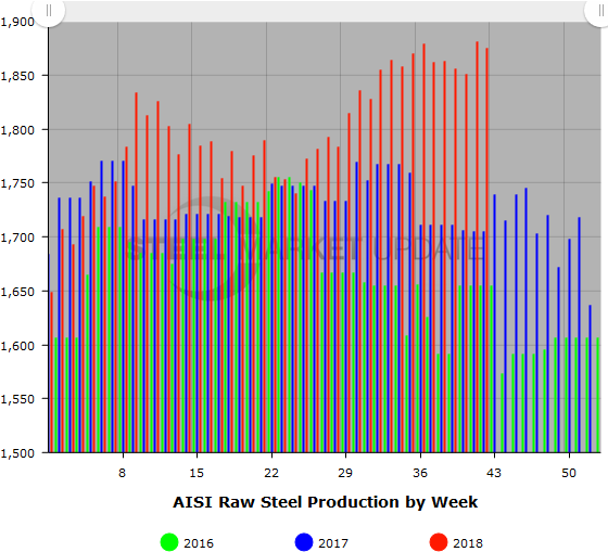 U.S. mills have operated at 80 percent of capacity or better for two weeks in a row. U.S. raw steel production for the week ending Oct. 20 totaled 1,875,000 net tons with the mills averaging 80.0 percent of their capability, down slightly from 80.2 percent reported the prior week, according to the American Iron and Steel Institute. The current week’s production represents a 10.0 percent jump from the same period last year when mill utilization was at 73.2 percent. Mills are currently operating near a four-year high.