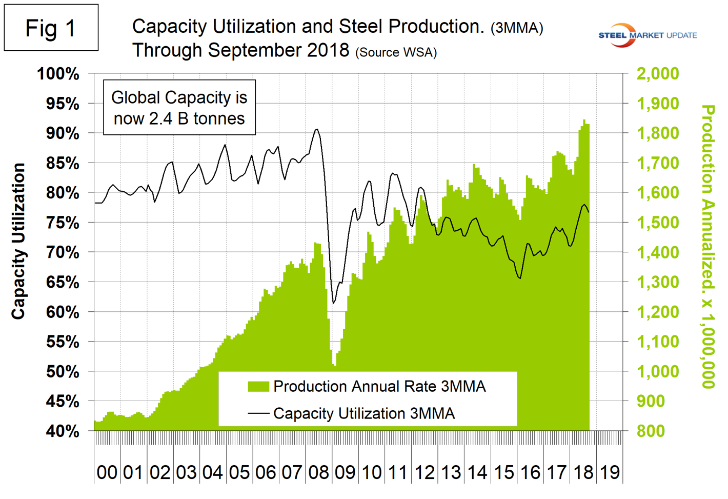 Global steel production in September hit an annual rate of 1.821 billion metric tons. Capacity is calculated to be 2.4 billion metric tons and capacity utilization in September was 76 percent, according to the latest Steel Market Update analysis of World Steel Association data. (Note, these numbers are the same as August’s preliminary values.) In three months through September, production in China grew by 10.0 percent year over year as the rest of the world grew by 1.3 percent. In 2018, China is increasing its share of global steel production, which in September was at another all-time high of 53.3 percent.