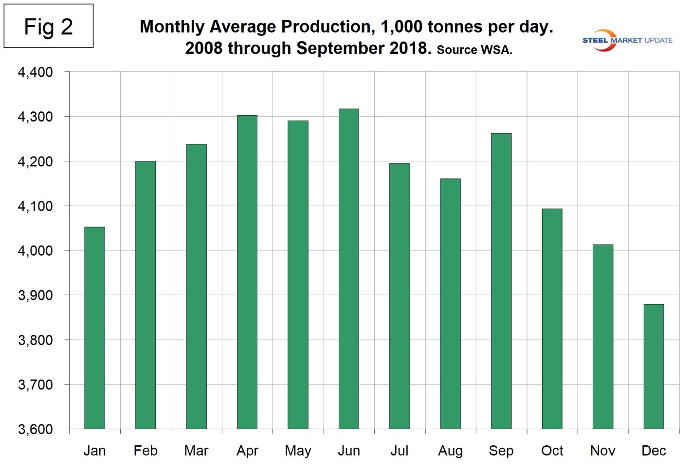 As we dig deeper, we start with seasonality. On average, global production on a tons-per-day basis peaked in the early summer in the years 2010 through 2016, but last year the second-half downtrend was delayed until November and in 2018 there is still no sign of a slowdown. (September dropped a day, which resulted in total production being down but tons per day being up.) Figure 2 shows the average tons per day of production for each month since 2008. On average, September increased by 2.46 percent. This year, September increased by 3.61 percent.
