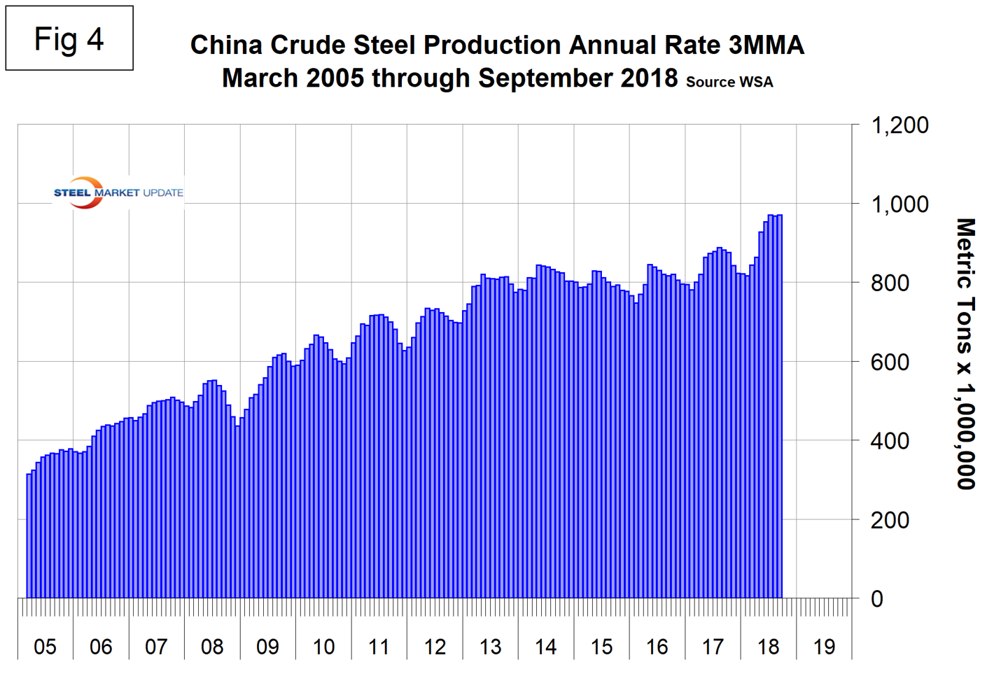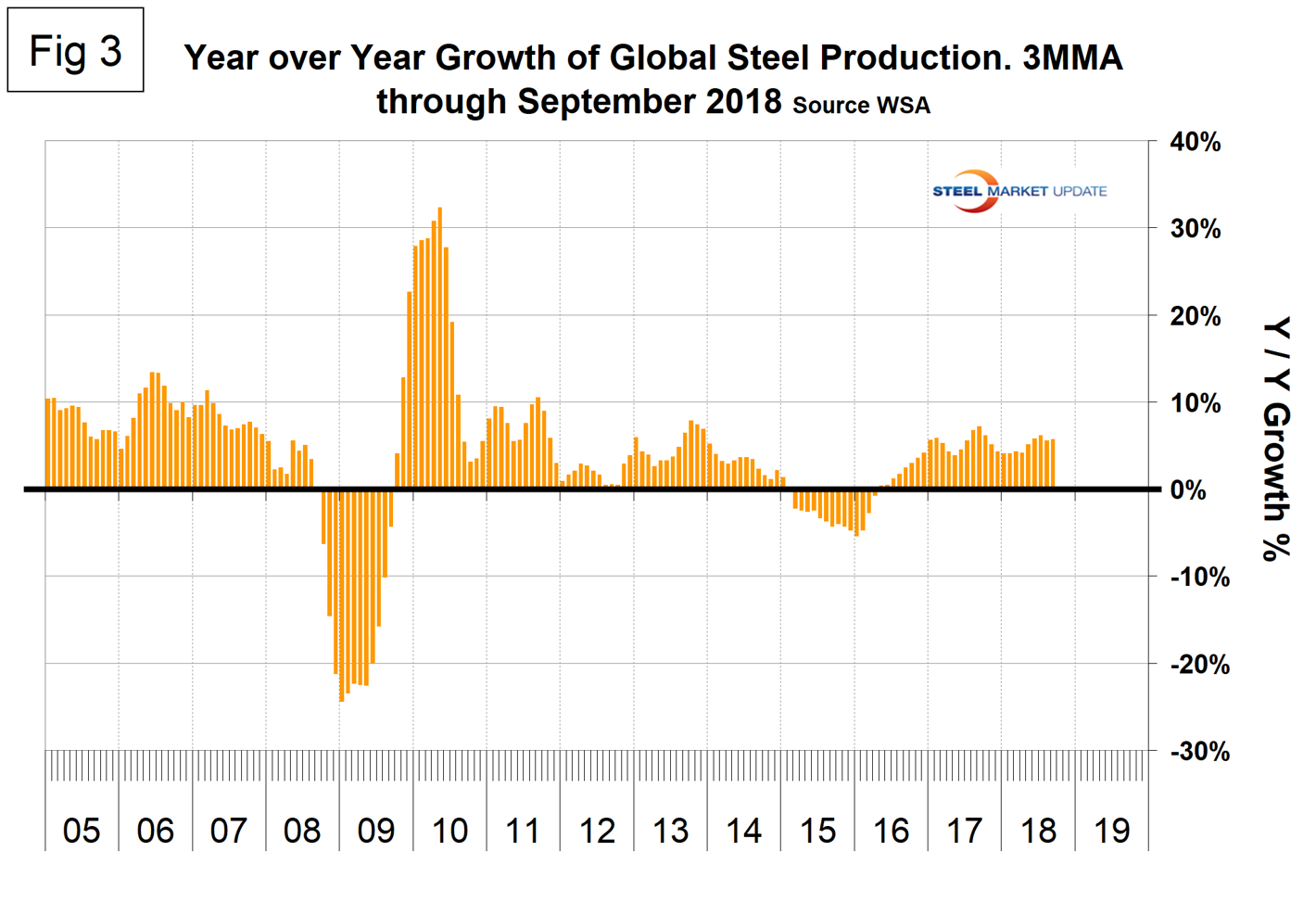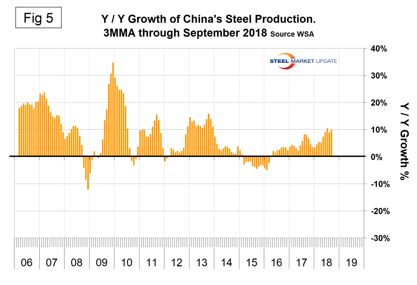 Figure 4 shows China’s production since 2005 and Figure 5 shows the year-over-year growth. China is increasingly dominating the global steel market and is approaching an annual rate of one billion tons of crude production. The WSA is forecasting a deceleration in China’s steel production growth in 2019. Last week, the chairman of the World Steel economics committee said that China is expected to experience zero growth in 2019, down from 6 percent this year. This is partly a result of trade tensions with the U.S., he reported.