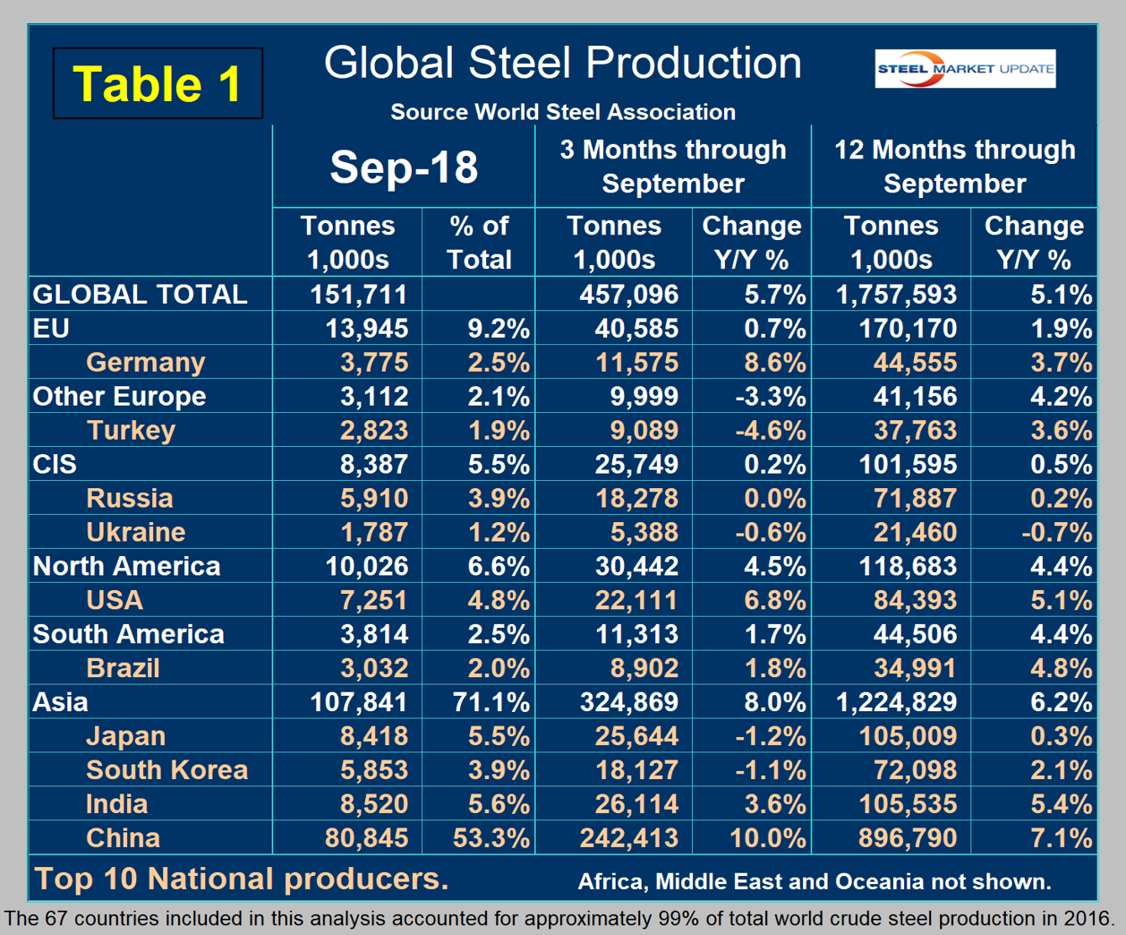SMU Comment: Trends have been consistent in recent months as the growth of China’s steel production continues to outpace the rest of the world. New plants are coming on stream and almost all of these are BOF-based, according to the August report by the OECD Steel Committee. For years now, we’ve been reading about China’s intent to reduce steel production. The remarks from the World Steel Association reported in this piece are typical. The fact is it isn’t happening! China’s share of global steel production was at an all-time high in September and their production is growing over seven times as fast as the rest of the world. The IMF released its October projection for global growth in 2018 and 2019 earlier this month and anticipates a 3.7 percent rate in 2019. This is well in excess of the 2.2 percent necessary to generate a continued growth in global steel demand.