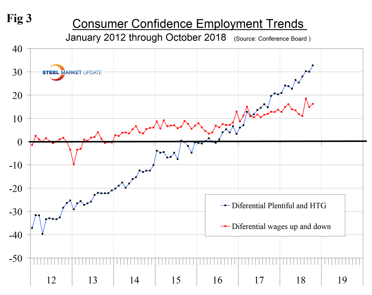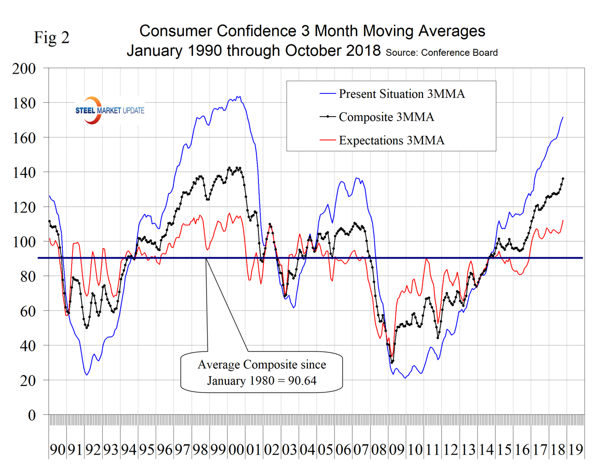 All three measures are higher than they were at the pre-recession peak of 2007. Expectations were relatively constant for over a year until August, but in September and October broke out of that range to the upside. The consumer’s view of the present situation has been surging since December 2010. Comparing October 2018 with October 2017, the 3MMA of the present situation was up by 22.6 and expectations were up by 7.6 points (Table 1).
