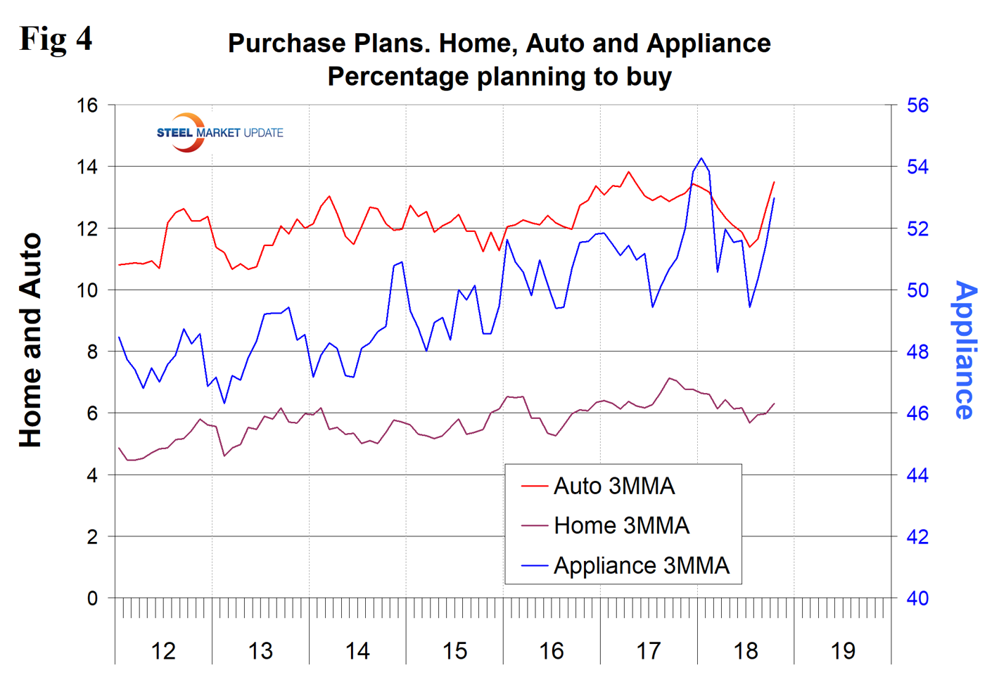 Plans to buy a car had been drifting down for nine months through July this year, but picked back up in the last three months of data. Plans to buy an appliance have been erratic, but there has been an upward trend since our data stream begins in 2012. Plans to buy a home drifted down from last September through July, but also picked back up in the last three months (Figure 4).