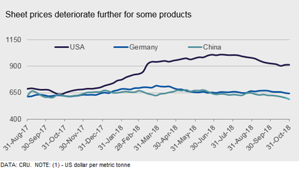 Sheet prices in Germany have remained unchanged this week. Last week’s Euroblech trade fair has not brought any immediate change to the spot market, though this may also reflect some holidays being taken around the industry. Feedback from the fair was generally negative towards near-term prices, with the feeling that customers were lacking in numbers and in interest towards fresh purchases. We expect to see this become reflected in prices shortly, and especially since prices continue to fall in Southern Europe. Italian HR coil prices are now approaching €500/t ($547 U.S.) and have lost over €30/t ($34 U.S.) during October.
