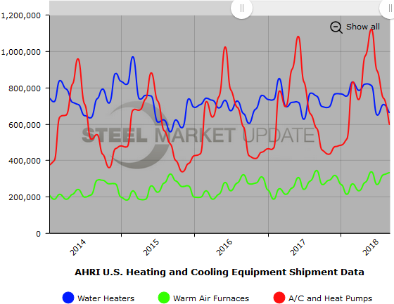 Below is a graph showing the history of total water heater, warm air furnace and air conditioner shipments. You will need to view the graph on our website to use it’s interactive features; you can do so by clicking here. If you need assistance with either logging in or navigating the website, contact info@SteelMarketUpdate.com.