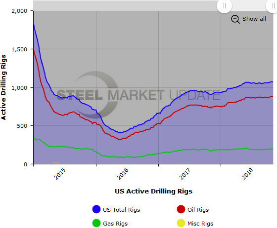 The U.S. active rotary rig count, an indicator of oil country tubular goods demand, declined slightly week over week, according to oilfield services company Baker Hughes. The number of active U.S. rigs fell by 1 to 1,067, with oil rigs down 1 to 874 rigs, gas rigs unchanged at 193 rigs, and miscellaneous rigs unchanged at 0 rigs. Compared to this time last year, the 1,067 count is up 169 rigs, with oil rigs up 145, gas rigs up 24, and miscellaneous rigs unchanged. See the first graph below for a history of active U.S. rig counts.