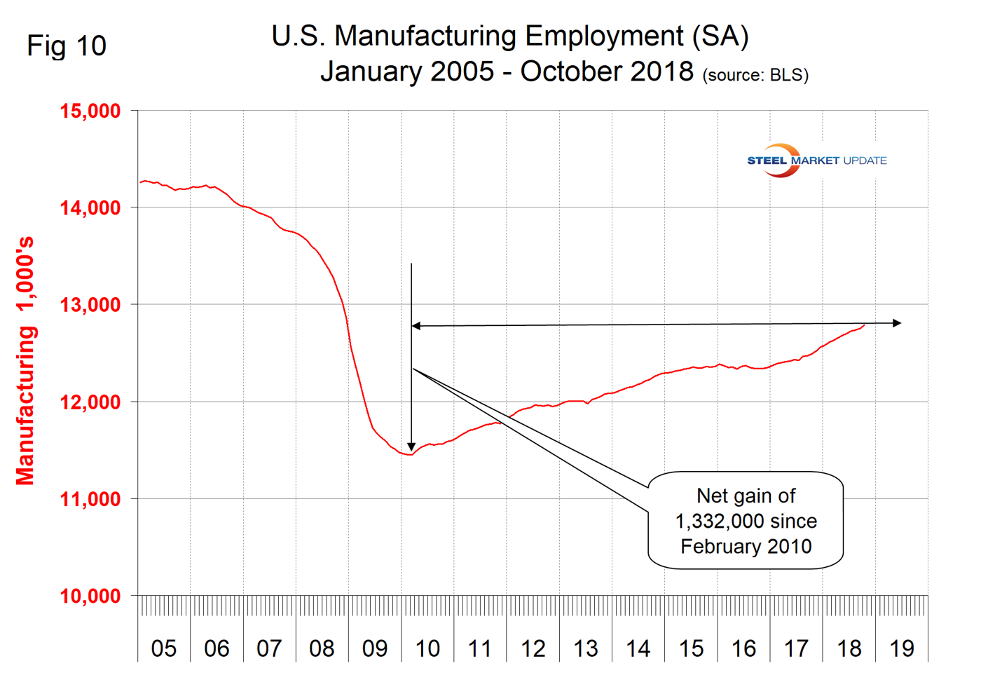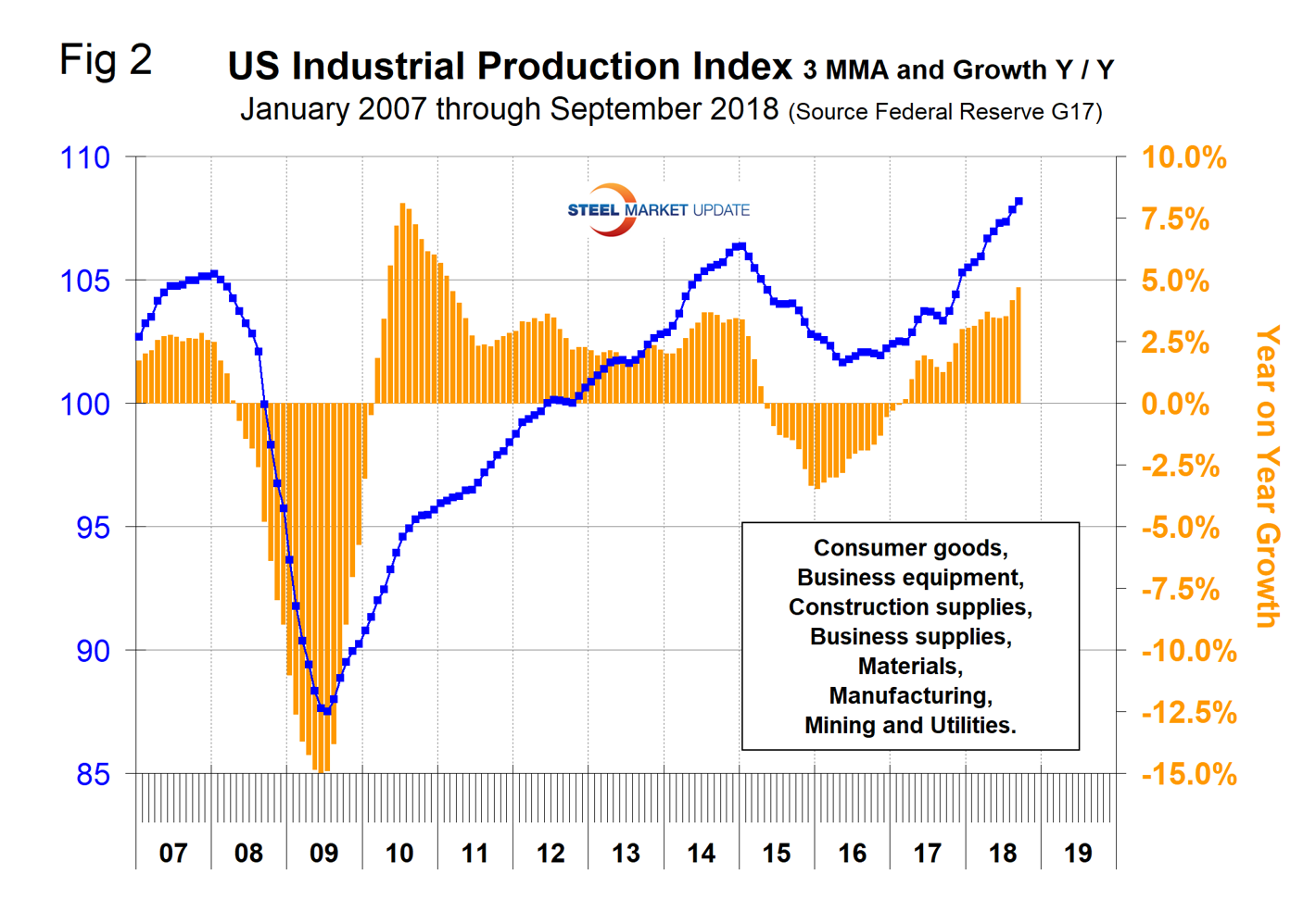 The U.S. Census Bureau announced last week that new orders for manufactured durable goods in September increased by 1.4 percent on a 3MMA basis month over month and were up by 10.0 percent year over year. Figure 4 shows the 3MMA since January 2010 and that the year-over-year improvement in 2018 has been the highest since 2014. The September increase was mainly driven by the volatile military aircraft segment, which in this instance masked the relevance for steel people. Nevertheless, the underlying trend is good.