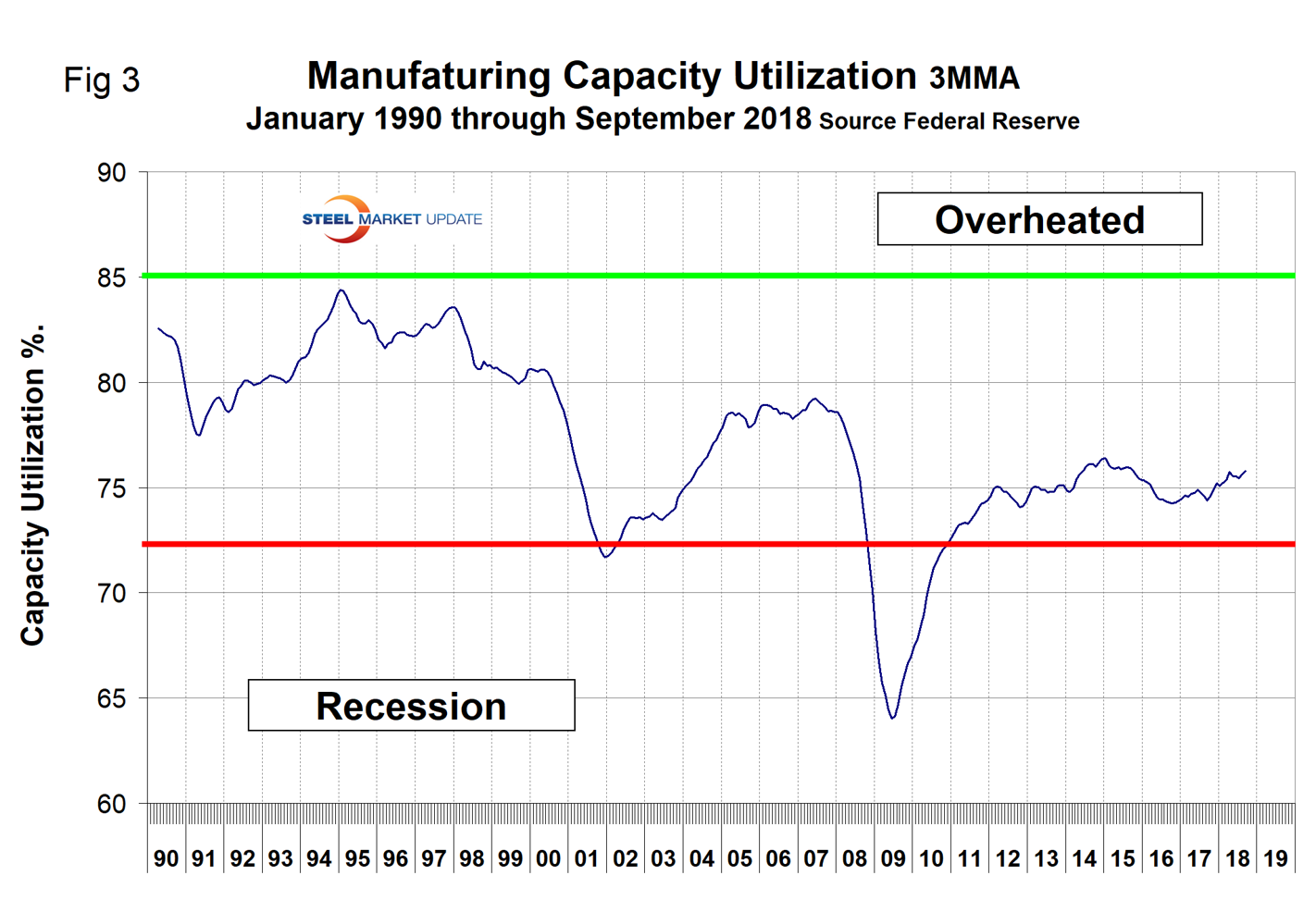 Figure 2 shows the three-month moving average (3MMA) of the IP index since January 2007 as the blue line and the year-over-year growth as the brown bars. March 2017 was the first month of positive growth in the 3MMA since April 2015. Growth has been above 3 percent every month since February, reaching 4.7 percent in September. Manufacturing capacity utilization improved from 74.48 percent in January last year to 75.8 percent in September 2018, also on a 3MMA basis (Figure 3).